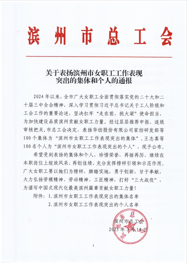 近日,濱州市總工會公布《關(guān)于表揚(yáng)濱州市女職工工作表現(xiàn)突出的集體和個人的通報》文件,家紡研發(fā)部憑借卓越的工作表現(xiàn)和突出貢獻(xiàn),榮獲“濱州市女職工工作表現(xiàn)突出的集體”榮譽(yù)稱號。